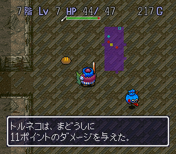 7階。パンが見つからない中、まどうしはアイテムを落しやすいはずと祈るような気持で倒したら、見事にパンを落してくれました。しかも、大きいパンでこれで一息つけます。でも、余分なパンが無いままだと、レベル上げは出来ないです。とりあえず、アイテムを拾ってからと思ったら、落とし穴に落ちて8階に。大丈夫なんでしょうか。